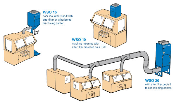 WSO主要優(yōu)點有:1. WSO油霧過濾器可以滿足各種設備的安裝要求:可安裝在機頂、地面或連接中央管道系統(tǒng),如下圖: